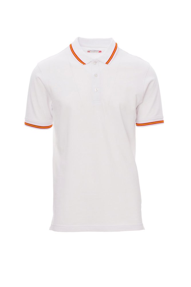 Unisex poloshirt met korte mouwen met 3 gekleurde knopen, kraag en mouwen met contrasterende rand (kleuren van de vlag), ribkraag en geribde mouwboorden, zijsplitten met versterkte naden, verborgen stiksels bij de kraag, versterkingsband aan de zijkant, elastische naden, band aan de binnenzijde van de nek.