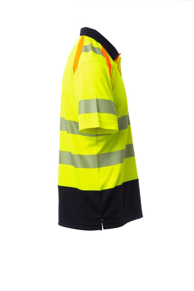 Tweekleurig poloshirt met korte mouwen, met hoge zichtbaarheid. Kraag met 3 knopen, met ribboord en bedekte naden, contrasterende opening. Kraag met ribboord. Gesegmenteerde, gesealde reflecterende banden op de schouders, de mouwen en de taille voor meer bewegingsvrijheid. Splitjes aan de zijkanten.