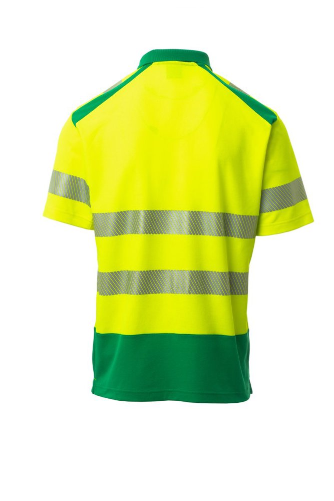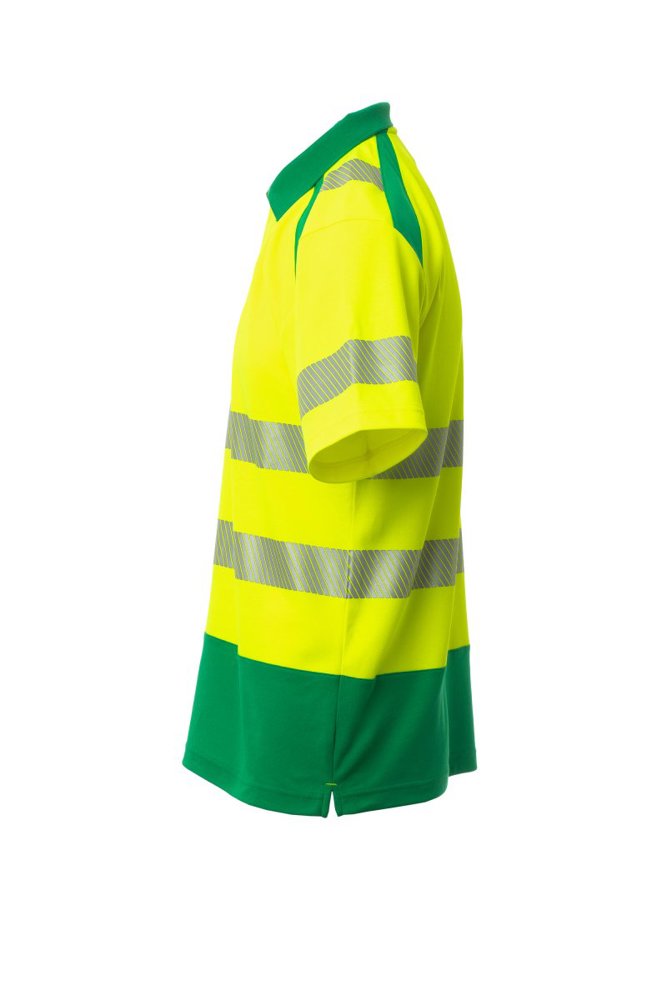 Poloshirt met korte mouwen, met hoge zichtbaarheid. Kraag met 3 knopen, met ribboord en bedekte naden. Splitten opzij. Gesegmenteerde, gesealde reflecterende banden voor meer bewegingsvrijheid. De stof, gemaakt van katoen aan de binnenkant en polyester aan de buitenkant, zorgt voor een groot ademend vermogen en comfort, maar ook voor een grotere duurzaamheid.