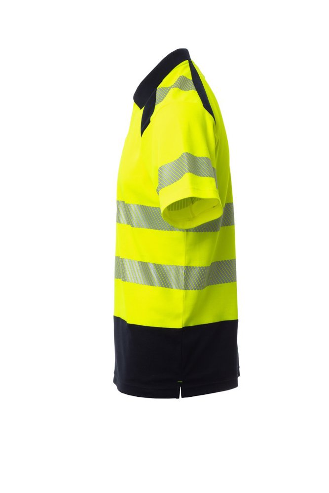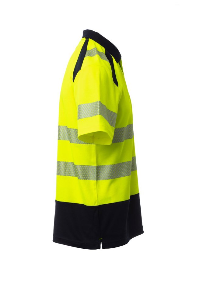 Poloshirt met korte mouwen, met hoge zichtbaarheid. Kraag met 3 knopen, met ribboord en bedekte naden. Splitten opzij. Gesegmenteerde, gesealde reflecterende banden voor meer bewegingsvrijheid. De stof, gemaakt van katoen aan de binnenkant en polyester aan de buitenkant, zorgt voor een groot ademend vermogen en comfort, maar ook voor een grotere duurzaamheid.