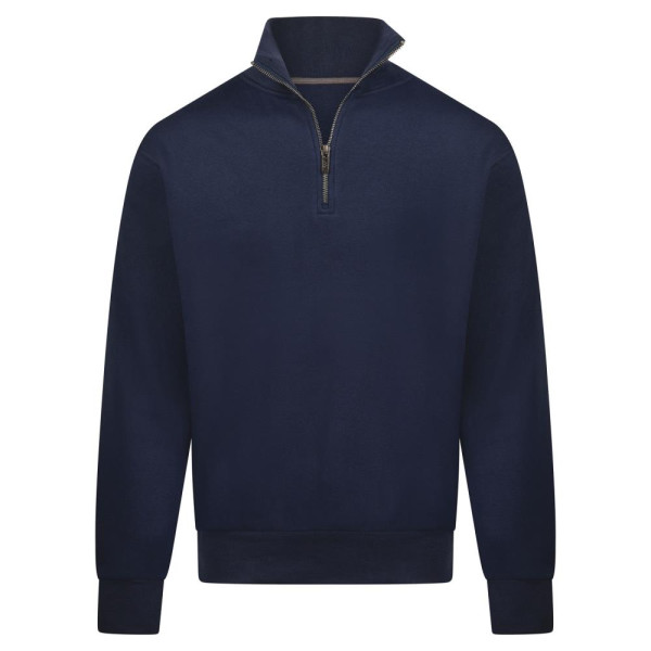 - Duurzame 280-grams zipneck sweater, vervaardigd uit 70% voorgekrompen katoen en 30% gerecycled polyester.