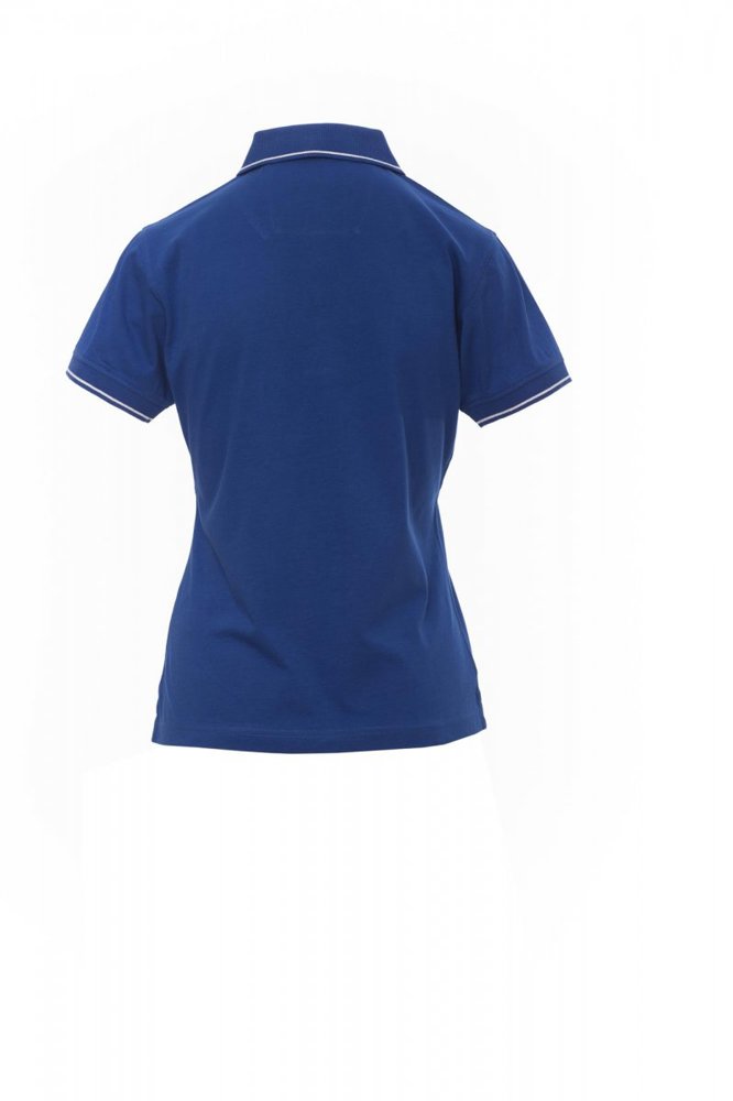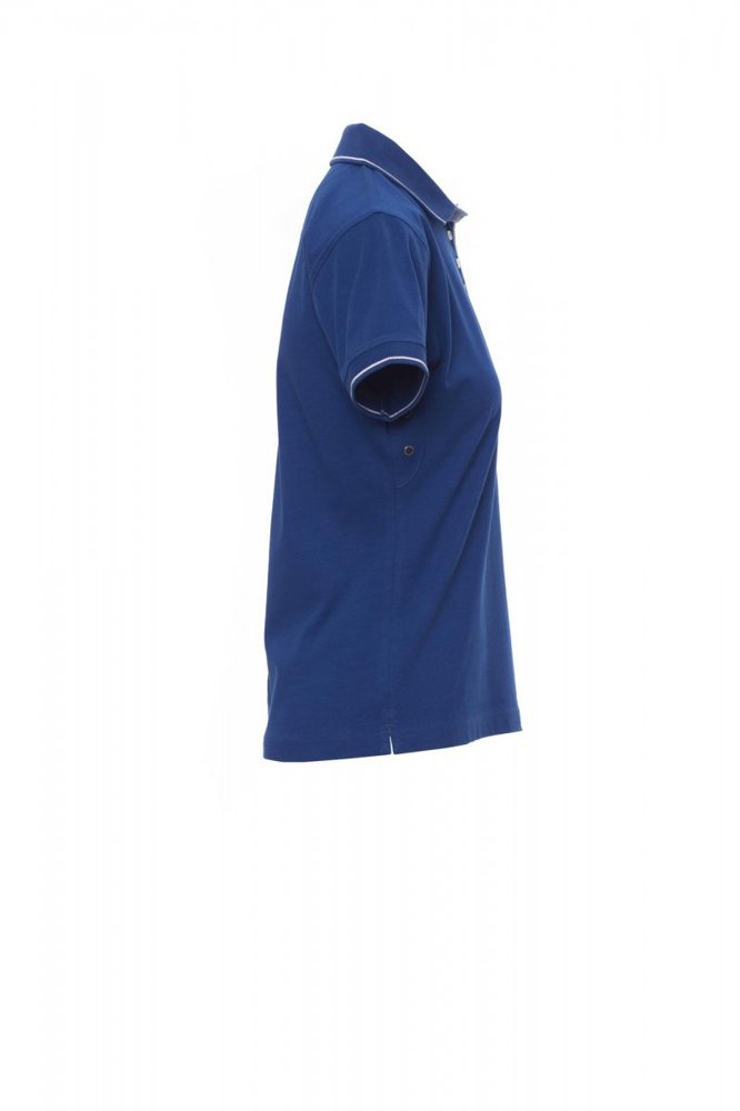 Nauwsluitend damespoloshirt met korte mouwen met 6 witte knopen, binnenkraag, overslag en zijsplitten in Oxfordblauw, ribkraag en mouwrand met fijne contrasterende strepen, oogjes onder de arm, zijsplitten met versterkte naden, verborgen stiksels bij de kraag, versterkingsband aan de zijkant, elastische naden, band aan de binnenzijde van de nek