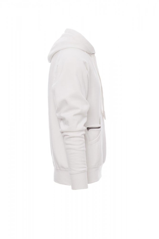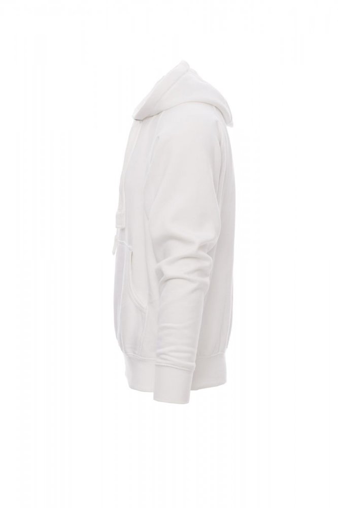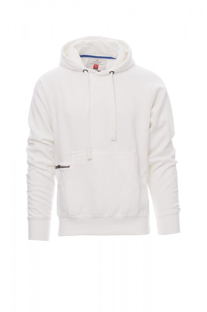 Herenhoodie met dubbel gestikte naden en wit trekkoord met contrasterend stiksel en metalen ringen, raglanmouwen, V-stiksel bij de hals, kangoeroezakken, kleine zak met rits, ribboorden met stretch aan de zoom en mouwen, versterkte naden.
