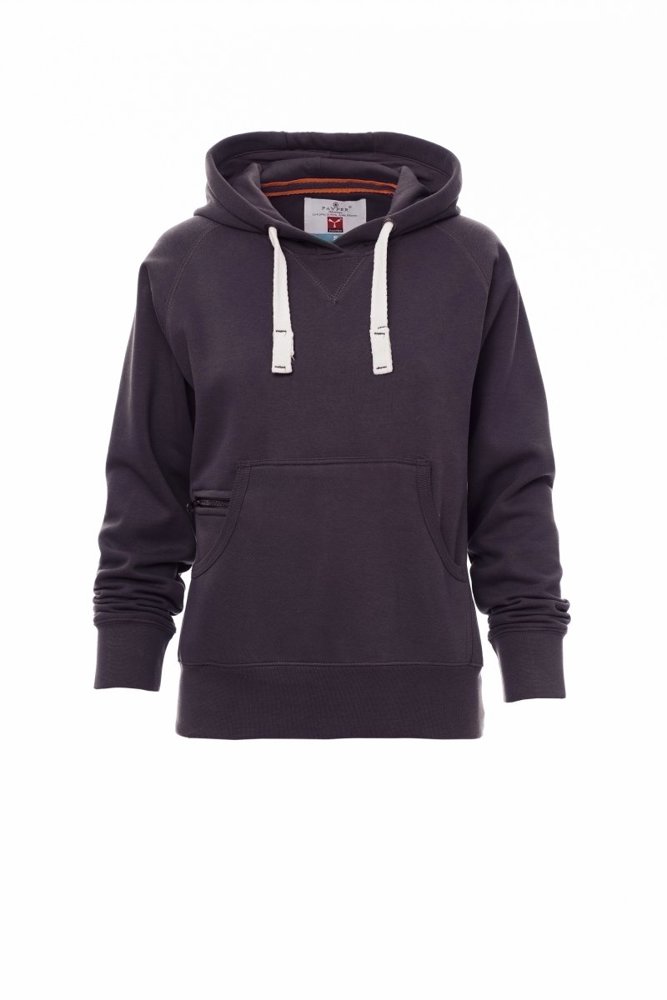 Nauwsluitende dameshoodie met dubbel gestikte naden en wit trekkoord met contrasterend stiksel en metalen ringen, raglanmouwen, V-stiksel bij de hals, kangoeroezakken, kleine zak met rits, ribboorden met stretch aan de zoom en mouwen, versterkte naden.