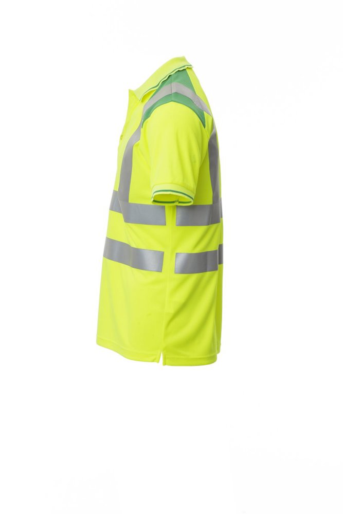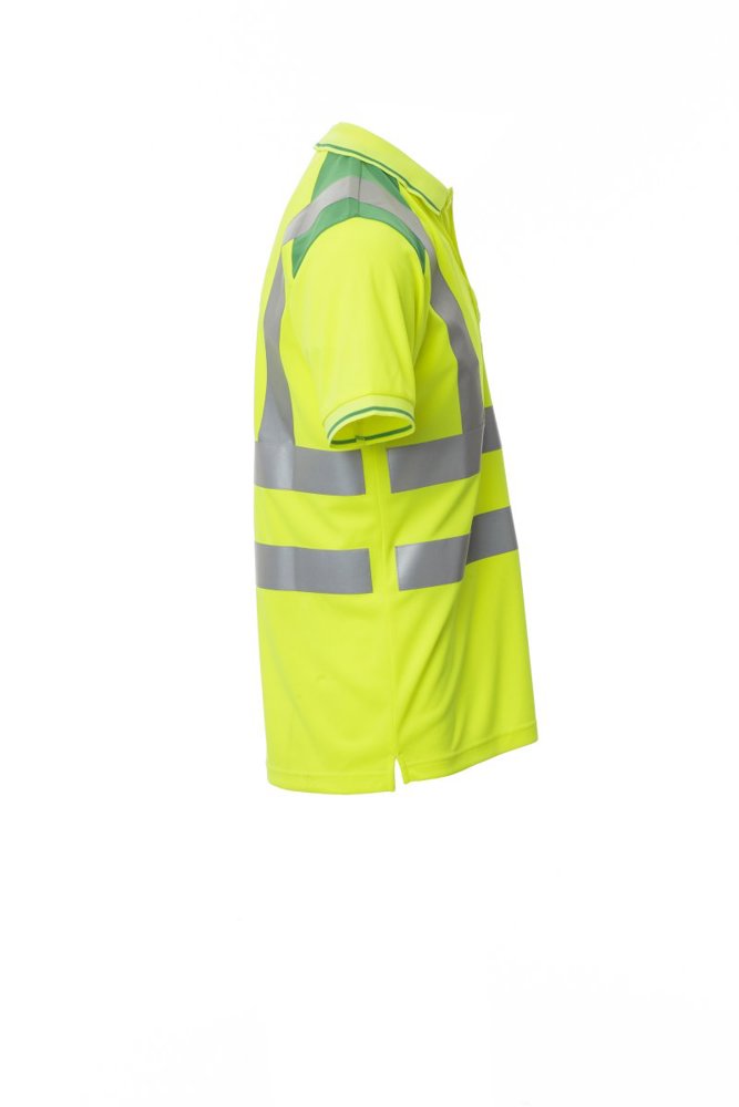 Herenpoloshirt met hoge zichtbaarheid, met korte mouwen, in twee kleuren, met reflecterende strepen, met drie bijpassende knopen met parelmoereffect, contrasterende fijne ribkraag en mouwrand, zijsplitten, verborgen stiksel bij de kraag.