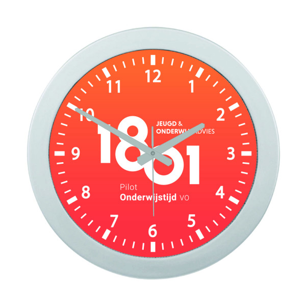 Wandklok rond quartz met kunststof rand en echt glas. Wijzers in zwart, wit of zilver, secondewijzers in rood, zilver of zwart. De wijzerplaat is geheel naar wens te bedrukken in full colour. Optioneel kan de rand van de klok in de eigen huisstijlkleur geleverd worden. Het uurwerk heeft een slepende secondewijzer en tikt dus niet. GRATIS ontwerpservice voor uw klok!