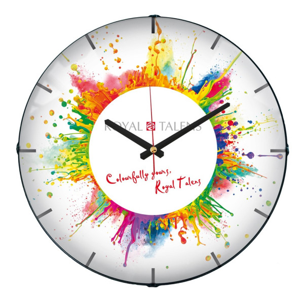 Wandklok rond quartz met zeer smalle kunststof rand echt gebold glas. Wijzers in zwart, wit of zilver, secondewijzers in rood, zilver of zwart. De wijzerplaat is geheel naar wens te bedrukken in full colour. Het uurwerk heeft een slepende secondewijzer en tikt dus niet. GRATIS ontwerpservice voor uw klok!