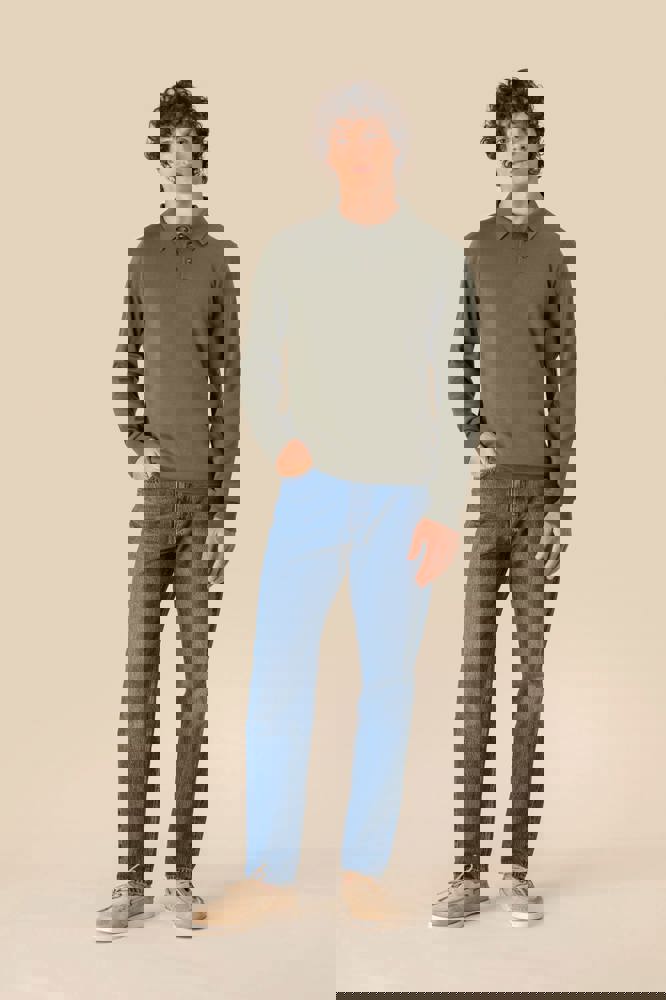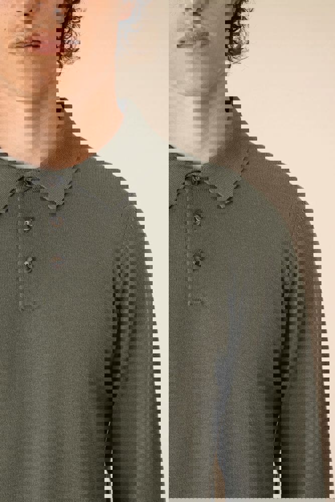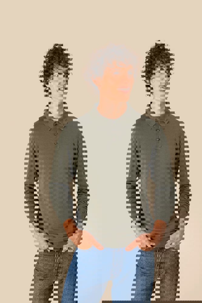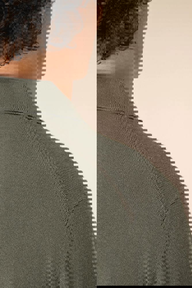 100% biologisch katoen. Gekamd katoen. Gauge 12. Rechte snit. Knooplijst met 3 knopen. Contrasterende knopen van gerecycled plastic met hoornlook. 1x1 ribboord aan hals, mouwuiteinden en onderkant kledingstuk. De hals is aan de binnenkant afgewerkt met ton-sur-ton nektape in de hoofdstof. Breiwerk in 'Fully Fashion'. Behandeld tegen pluizen. Gewicht van het artikel in maat L: 270 g.