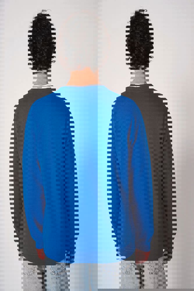 50% katoen / 50% polyester. Geruwd molton, tubulair geweven. Rechte snit. Hals, mouwboorden en zoom in 1x1 ribboord met dubbele stiksels. Afneembaar merklabel.
