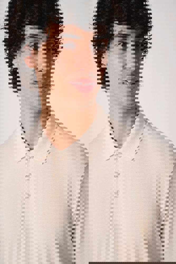 Effen kleuren: 100% katoen. Kleur Ideal Ash Heather: 99% katoen / 1% viscose. Kleur Ideal Oxford Grey: 90% katoen / 10% viscose. Piqué breisel. Rechte snit. Kraag in 1x1 ribboord. Sluiting met 3 toon-op-toon knopen. Toon-op-toon nektape aan de binnenzijde. Zijsplitjes. Mouwboorden en zoom afgewerkt met dubbele stiksels. Afneembaar merklabel.