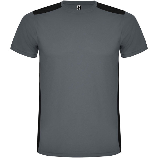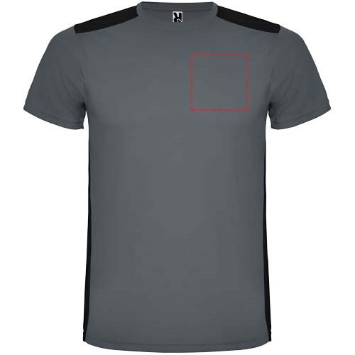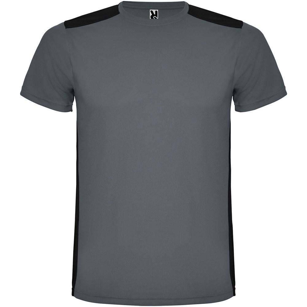 Gemakkelijk drogende, technische en ademende stof. Ronde hals. Combinatie van twee polyesterstoffen op de rug en schouders. Birdseye-stof aan de voorkant en ademende 3D-meshstof aan de achterkant. Stof voorbereid voor vochtopname. Decoratieve zigzagsteek aan de zijkanten en schouders. Rugpatroon is iets langer. Verwijderbaar label.