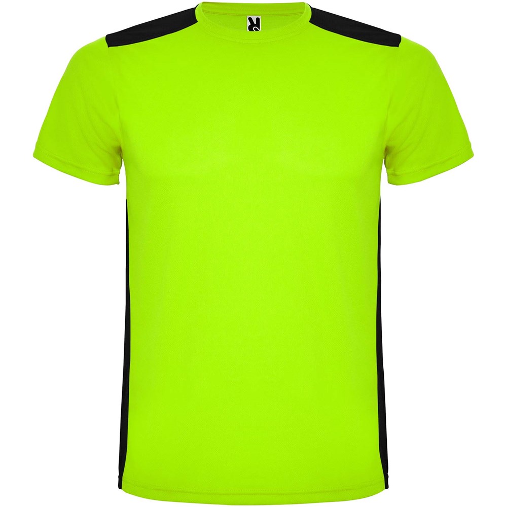Gemakkelijk drogende, technische en ademende stof. Ronde hals. Combinatie van twee polyesterstoffen op de rug en schouders. Birdseye-stof aan de voorkant en ademende 3D-meshstof aan de achterkant. Stof voorbereid voor vochtopname. Decoratieve zigzagsteek aan de zijkanten en schouders. Rugpatroon is iets langer. Verwijderbaar label.