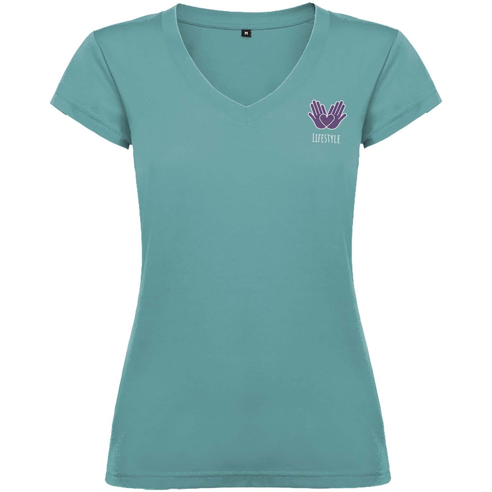 T-shirt met korte mouwen en V-hals voor dames, met 1x1 geribbelde afwerkingen. Slim-fit met zijnaden. Verwijderbaar etiket. Het model is 174 cm en draagt maat S.