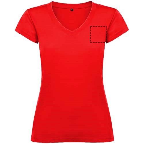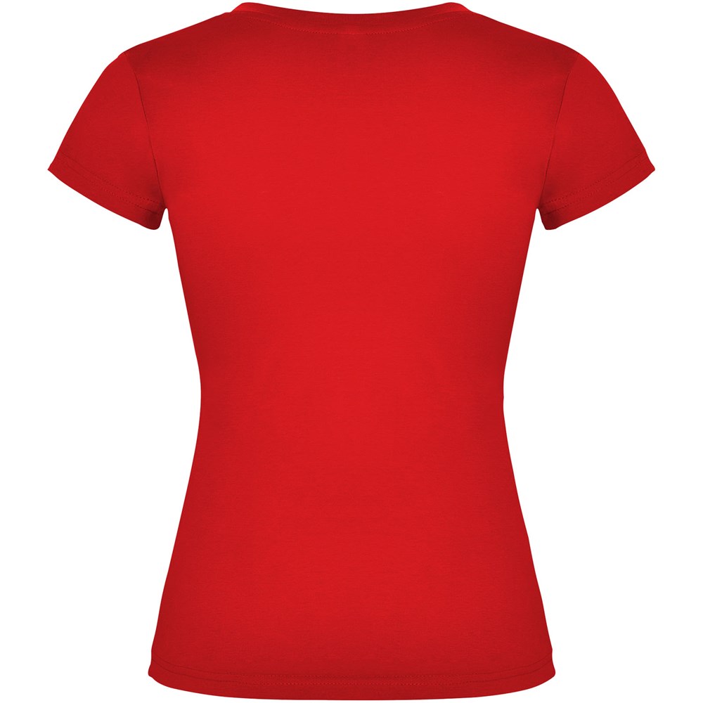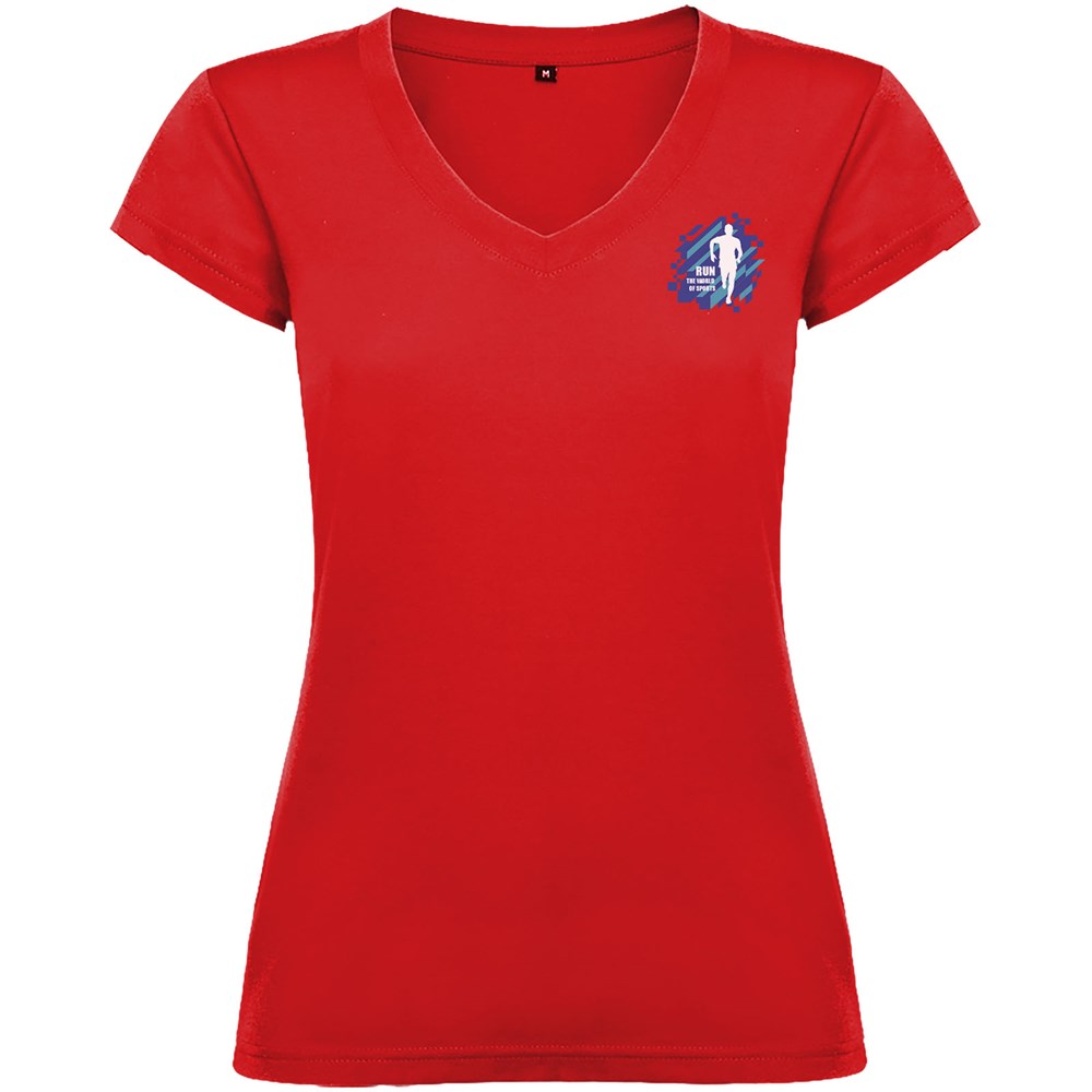 T-shirt met korte mouwen en V-hals voor dames, met 1x1 geribbelde afwerkingen. Slim-fit met zijnaden. Verwijderbaar etiket. Het model is 174 cm en draagt maat S.