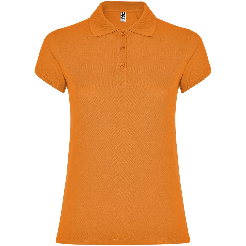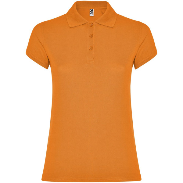 Poloshirt met korte mouwen voor dames. Versterkte bedekte naden in de binnenkant van de kraag. 1x1 geribde kraag en manchetten. Zijnaden en aansluitende snit. Smalle sluiting met drie knopen. Zijsplitten. Verwijderbaar etiket. Het model is 179 cm en draagt maat S.
