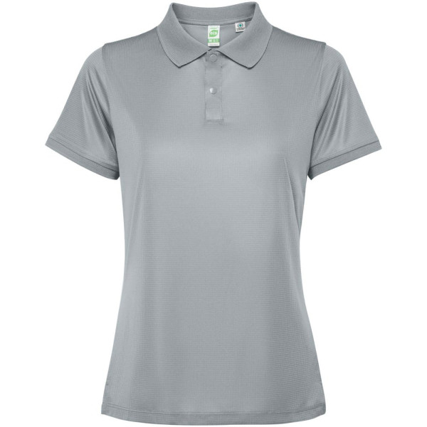 Getailleerde damespolo met korte mouwen. Versterkte bedekte naden in de binnenkraag. 1x1 geribde manchetten en kraag. Zijnaden. Knoopsluiting met 3 knopen en zijsplitten.