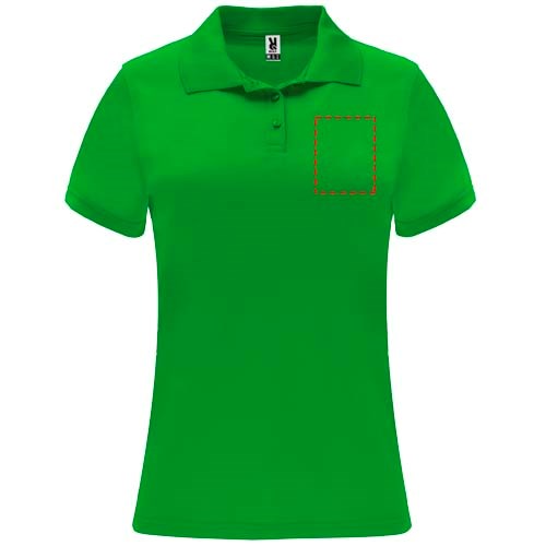 Technisch poloshirt met korte mouwen voor dames. Gebreide kraag met sluiting met drie knopen. Getailleerde snit. Ademende, gemakkelijk wasbare en droge stof. Verwijderbaar etiket. Technische stof. Ademende stof. Het model is 173 cm en draagt maat S.