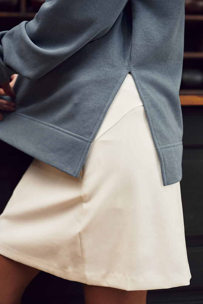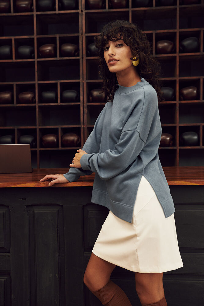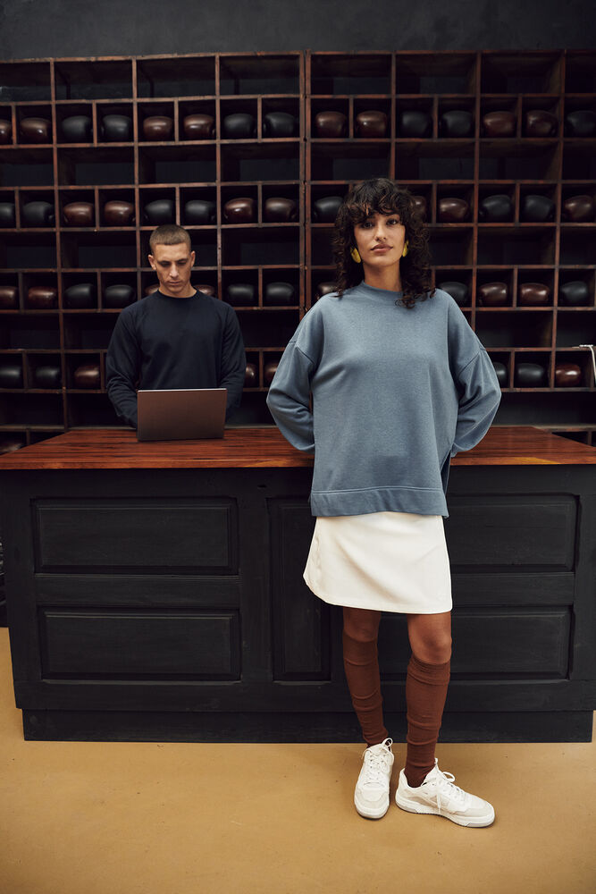 Een relaxede trui voor dames met ronde hals in French terry-kwaliteit, gemaakt van een mix van katoen en gerecycled polyester. De trui heeft licht afgezakte schouders en een split onderaan de zijnaden. De bredere elastische 2x2 rib heeft enkele stiksels bij de hals en onderkant van de mouwen. De trui is afgewerkt met een hoge zoom aan de onderkant, necktape van keperstof in contrastkleur en een gemakkelijk te verwijderen label voor rebranding. De zachte, gestabiliseerde stof is ontworpen voor intensief wassen en heeft een anti-pilling afwerking.