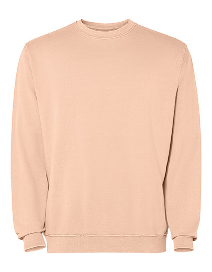 Unisex sweatshirt met ronde hals | Badstof katoen zuurgewassen | 2x1 geribde kraag, manchetten en zoom in toon | Verstevigde naden bij manchetten, zoom, tailleband en armsgaten | Deksteek in dezelfde kleur bij de hals