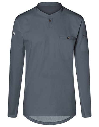 Voorkant: keperstof | Rug: jersey piqué, ademend, vochtregulerend | Lange mouwen | Pasvorm op maat | Halslijn met smalle opstaande kraag en kleine knoopsluiting | Borst paspelzak met knoop | Ingezette zak op linkermouw