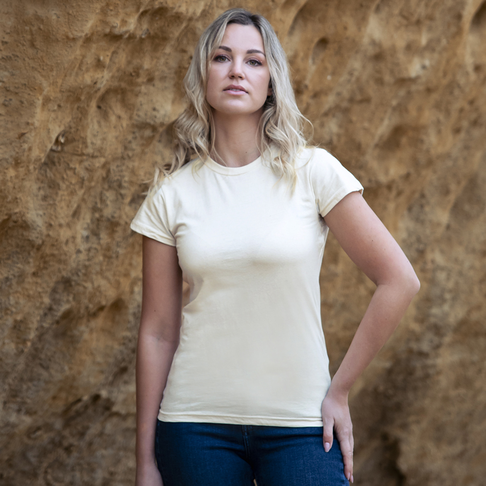 Dames-T-shirt Keya Organic Natural. Van 100% biologisch katoen, single jersey materiaal 150g/m2, met natuurlijke afwerking. Biologisch embleem op het etiket. Verkrijgbaar in de maten S,M,L,XL,XXL.