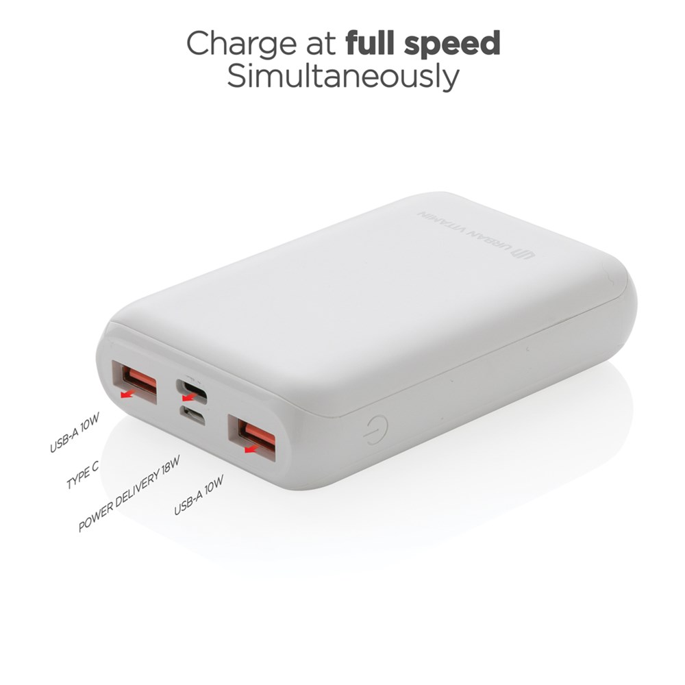 Laad je telefoon tot 2,5 keer op met deze snelladende powerbank. Dankzij de ultrasnelle type C 18W PD poort laadt de powerbank in recordtijd op. Het opladen van je telefoon tot 50% duurt slechts 30 minuten. Langzaam opladen is iets uit het verleden. De powerbank bevat een duurzame A-klasse 10.000 mAh batterij om al je apparaten op te laden tijdens je reizen en avonturen. Met de dubbele USB A en type C poort laad je tot 3 apparaten tegelijk op. Urban Vitamin items zijn gemaakt zonder PVC en verpakt in plastic gereduceerde verpakking. Type-C-ingang: 5V/3A, 9V/2A; Micro-USB-ingang: 5V/2A, 9V/2A; Type-C-uitgang: 5V/3A, 9V/2A, 12V/1.5A; USB-uitgang: 5V/2.4A, 9V/2A, 12V/1.5A