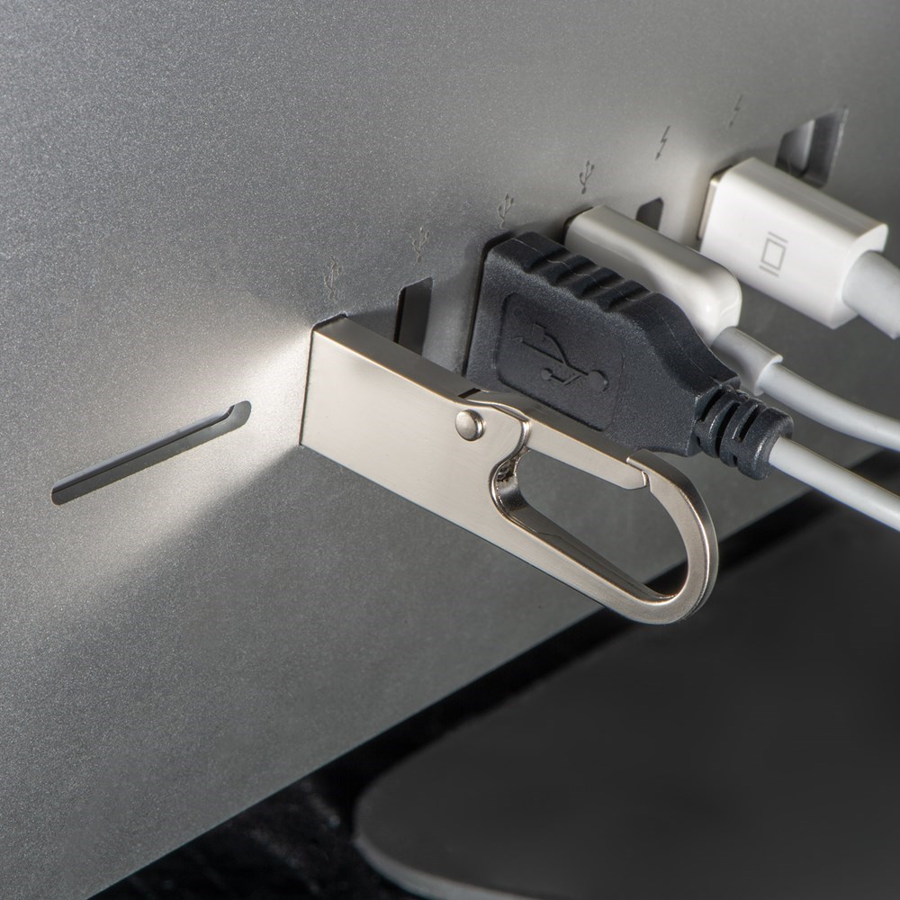 Metalen USB-stick met karabijnhaak. Uw reclame wordt op het metalen oppervlak gegraveerd. Voor leveringen binnen Nederland geldt wettelijke kopieerheffing van € 0.60 per stuk