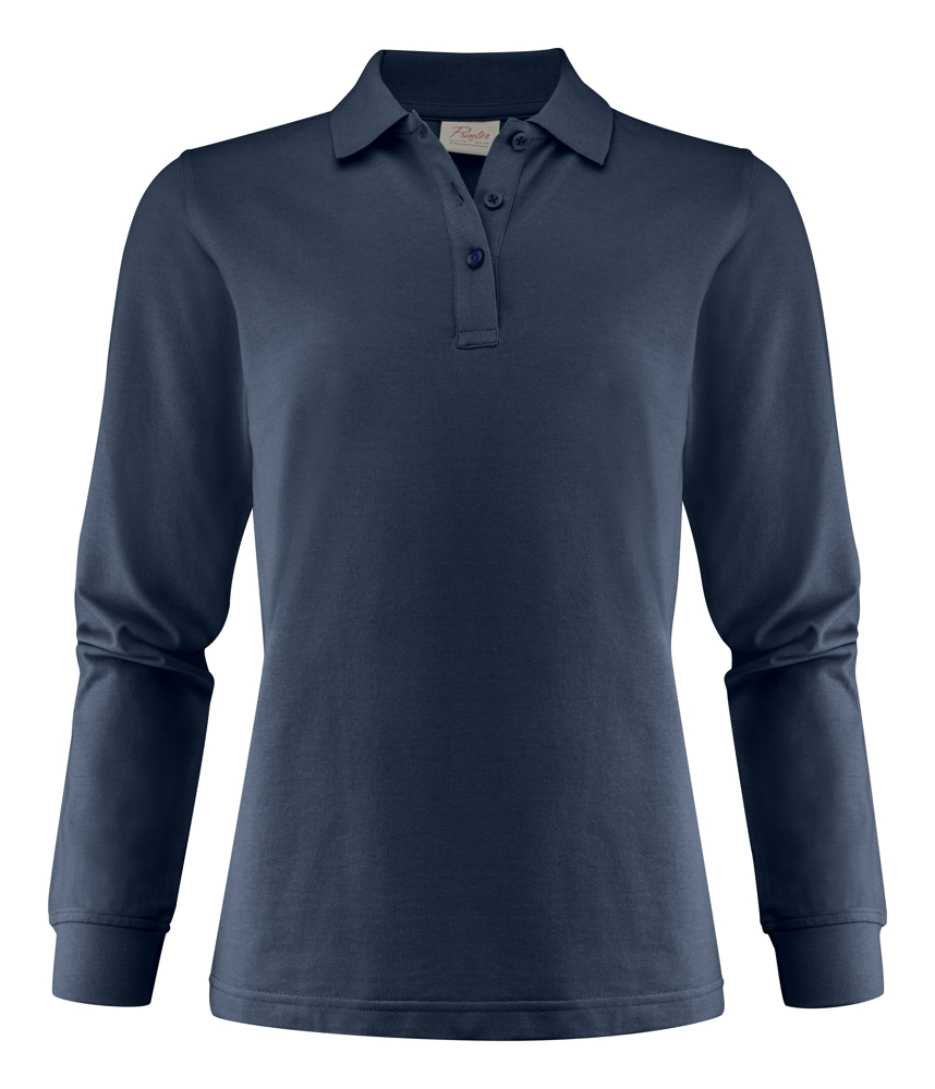 Polo piqué met lange mouwen, tricotkraag en zijsplitten. Drieknoopssluiting. Aan de binnenkant van de linker zijnaad werd een zakje voorzien voor het innaaien van een waschip. Oeko-Tex 100 gecertificeerd.