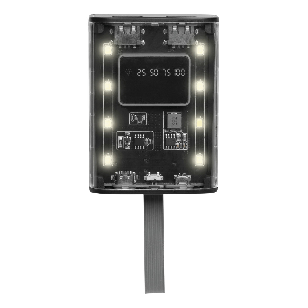 Powerbank / zaklamp OPEN SOURCE: Powerbank geschikt voor smartphones en USB-gevoede apparaten, twee USB-uitgangen, 1 type C en 1 micro-USB-ingang, capaciteit: 6.000 mAh, incl. 3 geïntegreerde oplaadkabels op achterkant (Type A (input), Type C, Micro USB (output), laadniveau-indicator met verlichte cijfers, aan/uit schakelaar, krachtige batterij, ingangsvermogen: 5V/2A, uitgangsvermogen: max. 5V/2A, zaklamp met 8 warme LED's, 3 helderheidsniveaus en SOS-knipperlicht, met siliconen polsbandje