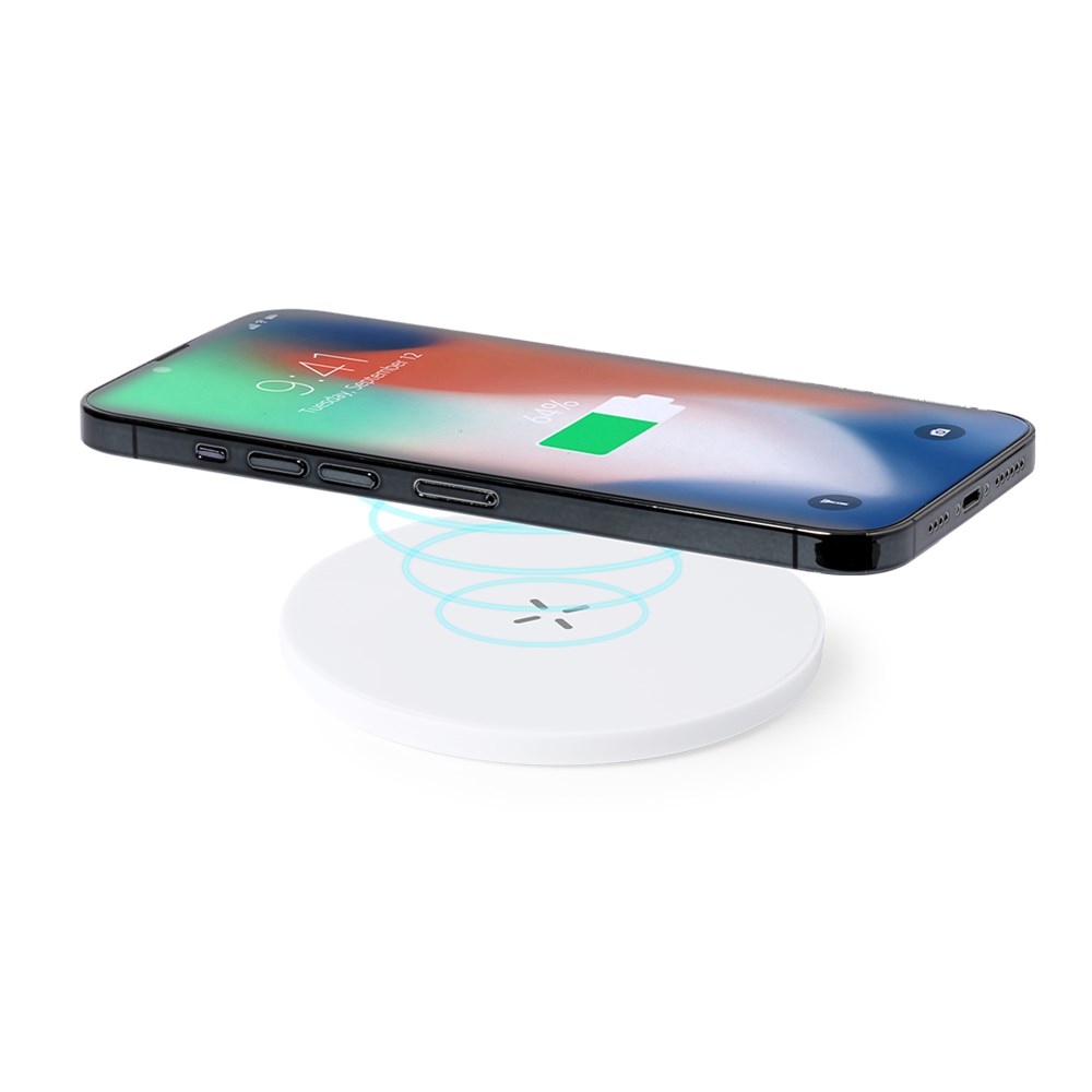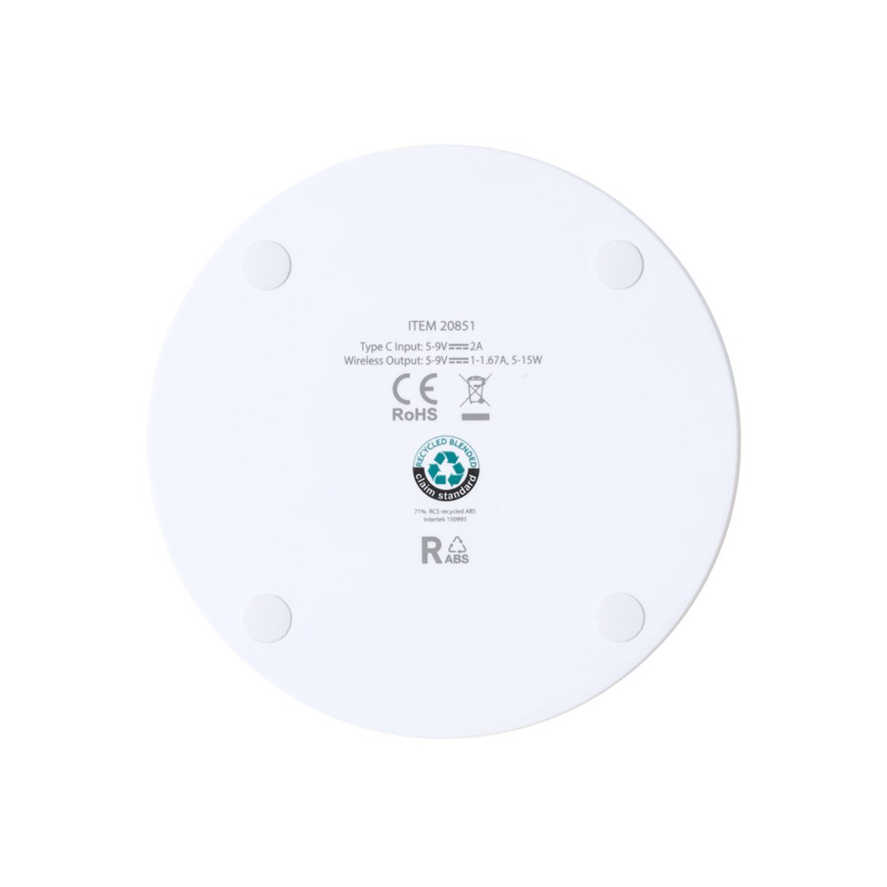 Draadloze oplader 15W in rond ontwerp gemaakt van RABS. Compatibel met apparaten uitgerust met Qi draadloze oplaadtechnologie. Antislipbasis, inclusief Type C-oplaadkabel. Gepresenteerd in een individuele kraftdesigndoos, met handleiding in het Engels en Spaans.