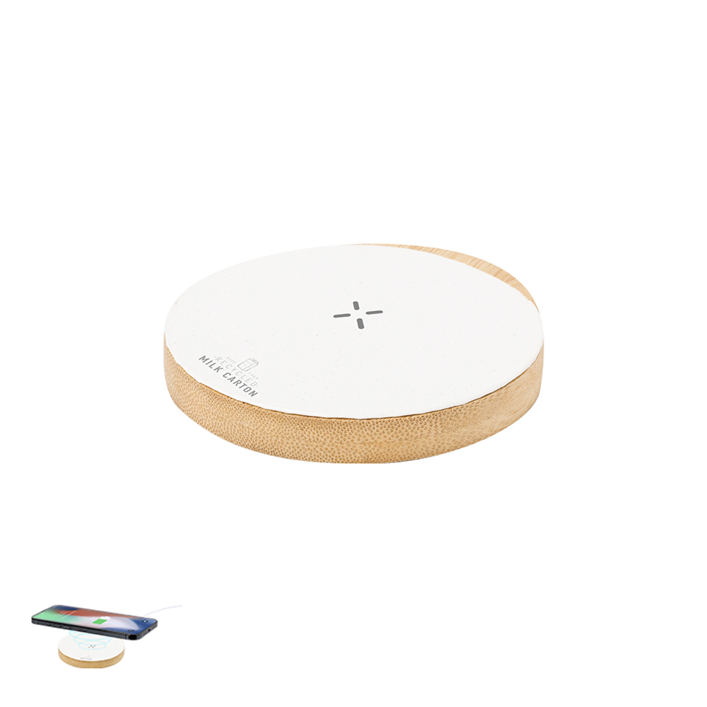 Draadloze oplader 15W met ronde vorm. Met oplaadoppervlak van gerecycled materiaal uit melkpakken en basis van bamboe, compatibel met apparaten uitgerust met Qi draadloze oplaadtechnologie. Type C oplaadkabel meegeleverd, met logo gerecyclede melkpakken in laadstation. Niet -slip bamboe basis en gepresenteerd in een individuele doos met kraft-ontwerp.Gebruiksaanwijzing in het Engels en Spaans.