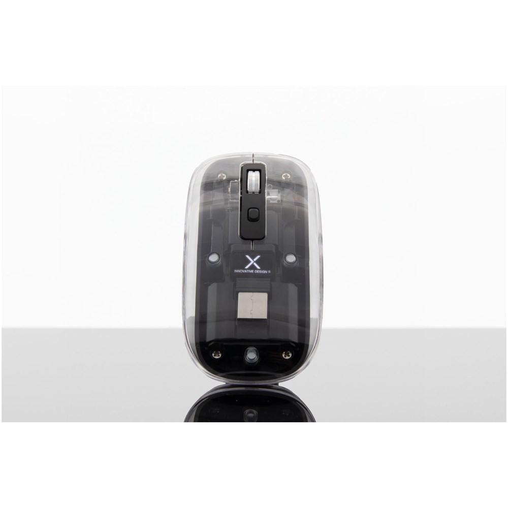 Oplaadbare draadloze multimode-muis met 3 knoppen, oplichtend logo en verwijderbare transparante magnetische bovenkant. De muis heeft 3 verbindingsmodi: 2,4 Ghz met USB-dongle, Bluetooth® 3.0 en Bluetooth® 5.2. Selecteer eenvoudig de juiste dpi-instelling 800/1200/1600 met de dpi-schakelaar bovenop. Het logo is helder wanneer de batterij is opgeladen en wordt donkerder wanneer er nog 20% van de batterijcapaciteit over is. De muis heeft een werkingstijd van 8 uur bij constant gebruik. De werkingstijd varieert afhankelijk van het gebruik en de computeromstandigheden. Verpakt in een gerecyclede kartonnen geschenkverpakking (13,7 x 8,3 x 4,8 cm).