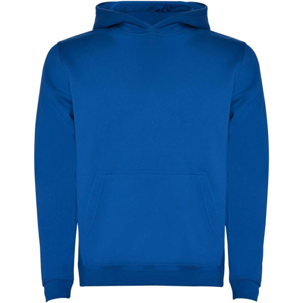 Tweekleurige hoodie met dubbele stof. Versterkte bedekte naden in de kraag en kangoeroezak. 1x1 elastaan rib in manchetten en tailleband. Verwijderbaar etiket. Het model is 120 cm en draagt maat 5/6.