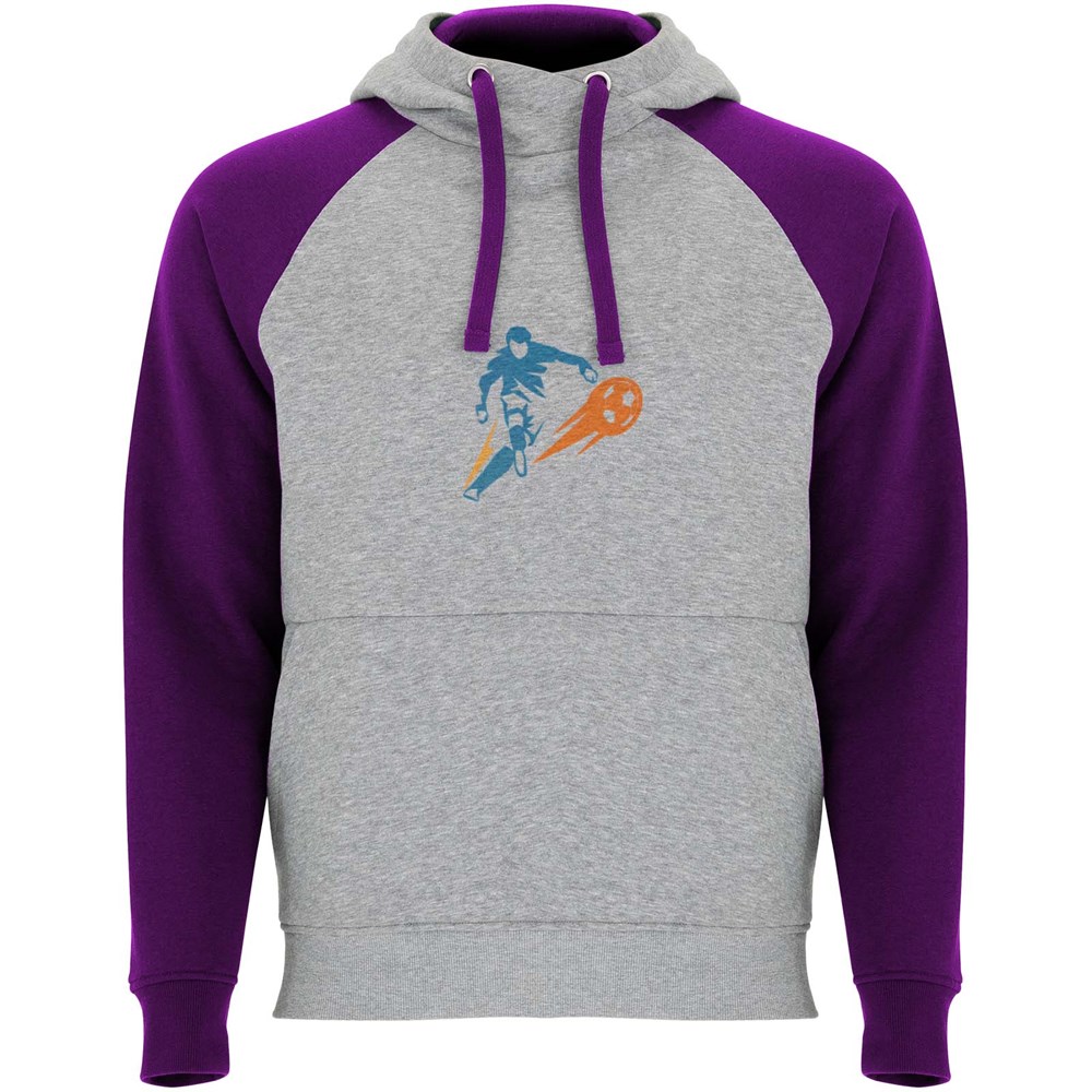 Tweekleurige unisex hoodie. Capuchon met gekruiste hals en metalen oogjes. Contrasterende binnenkant van de capuchon, trekkoord en raglanmouwen. Kangoeroezak. Manchetten en zoom van 1x1 ribgebreid elastaan. Verwijderbaar label.