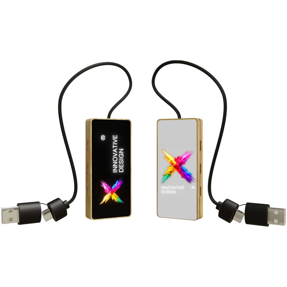8-in-1 USB-hub gemaakt van verantwoord geproduceerd bamboe en rPET, die tot 6 apparaten tegelijk kan aansluiten met 3 USB-A- en 3 Type-C-poorten. Hij is volledig compatibel met moderne computers, heeft een aanpasbaar led-logo en wordt geleverd in een geschenkverpakking van gerecycled karton, waardoor functionaliteit wordt gecombineerd met een geweldig design. Overdrachtssnelheid: USB/480 Mbps. Afmetingen: 8 x 3,5 x 1,5 cm. Kabellengte: 24 cm.