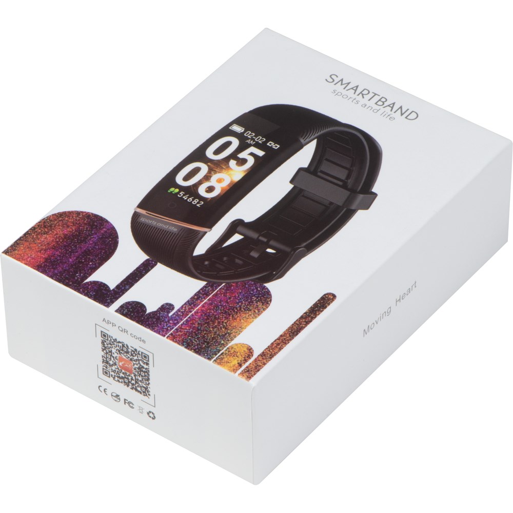 Smart fitness armband van siliconen met een kleuring verlicht display. Compatibal met iOS 8.0, Android 5.1, Bluetooth 4.0 en hoger. Eenvoudig oplaadbaar met een USB-stekker. Functies: datum, tijd, stappenteller, calorieverbruik, afstandsmeter, hartslagmeter, trainingsmode, etc. Binnen de app 'My State' kan alles bijgehouden worden. Uw reclame kan met een etiket op de verpakking aangebracht worden.