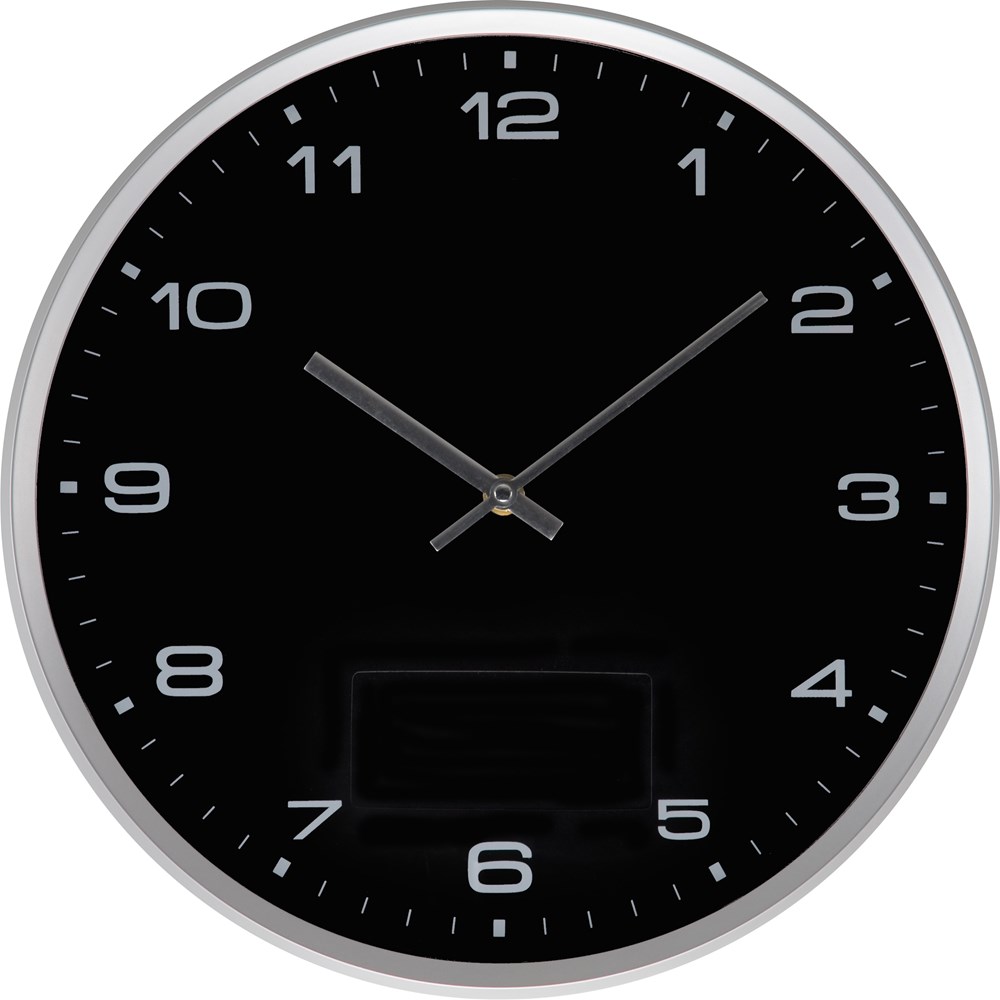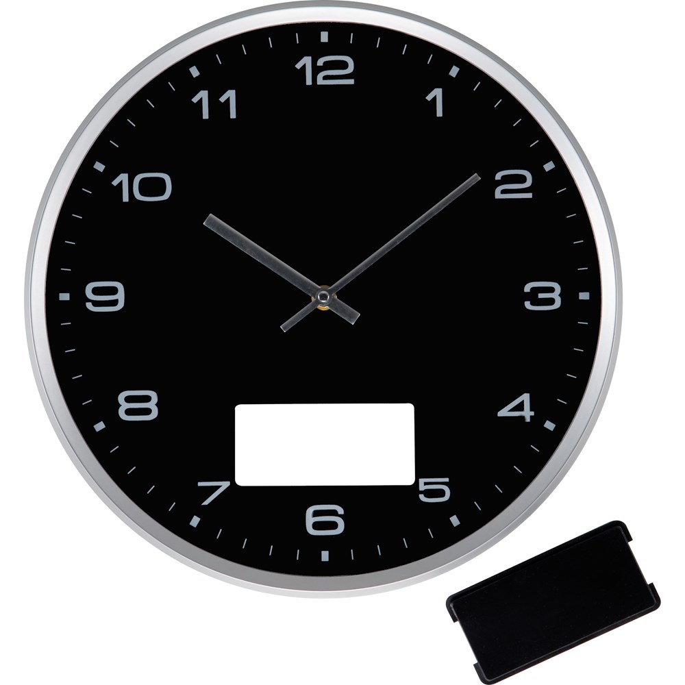 Wandklok in modern design die er niet alleen goed uitziet, maar is door het klik-systeem ook eenvoudig op de wijzerplaat te bedrukken. Uw reclame bedrukken wij op het uitneembare plaatje