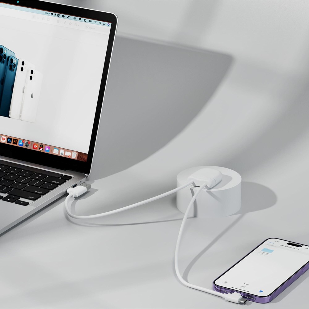 De 27Watt ICE-C oplaadkabel is onze nieuwste multi-oplaadkabel, met een dubbele USB & USB-C ingang en een dubbele USB-C & lightning uitgang. De kabel heeft een lengte van twee keer 50 cm en ondersteunt gegevensoverdracht en autoplay. De totale gerecyclede inhoud is 55% gebaseerd op het gewicht van het artikel. De kabel is verpakt in een duurzame FSC-gecertificeerde papieren envelop.