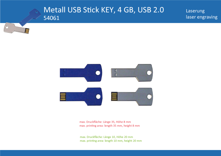 USB-stick “KEY” van roestvrij staal. In een originele vorm. Dankzij het oogje kan de stick gemakkelijk aan een sleutelbos worden bevestigd. Opslagcapaciteit 4 GB USB 2.0. INCLUSIEF hoogwaardige lasergravure aan één zijde. Geen gereedschapskosten als de gegevens in AI-formaat worden aangeleverd.