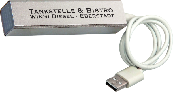 POWER BANK” mobiele, externe oplader in elegante aluminium behuizing. Met 2600 mAh voor het opladen van alle gangbare smartphones. Inclusief aansluitkabel. Geleverd in geschenkverpakking. (Formaat: 94 x 20 mm)