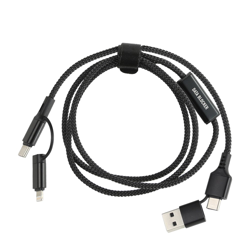 Extra lange oplaadkabel XXL. Met de geïntegreerde gegevensblokkering kun je gegevensoverdracht en synchronisatie fysiek blokkeren. Hierdoor kun je mobiele apparaten veilig opladen in auto's, op luchthavens en andere openbare plaatsen zonder dat je je zorgen hoeft te maken over hacken of het uploaden van virussen. 200 cm lange textiel oplaadkabel. Multifunctionele adapteroplossing Type-A /USB-C naar Type-C/Lightning plug Met zwarte kabelorganiser. Uitgang tot max. 3A. Datablocker-functie getest door DEKRA. Individueel verpakt in een zakje met instructiekaart.