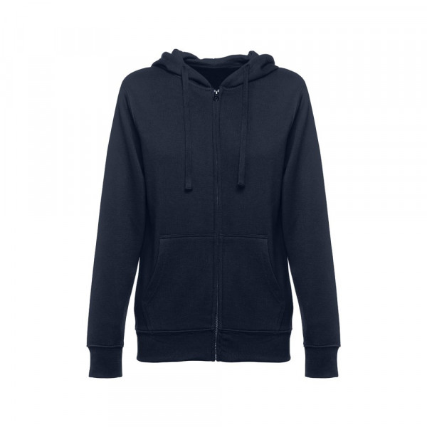 Dames sweatshirt van 50% katoen en 50% polyester (320 g/m²) met gekaarde binnenkant. De capuchon is gevoerd en bevat een gekleurde koordsluiting. Het voorste gedeelte heeft twee buidelzakken met een plastic sluiting. Stuk met manchetknopen en tailleband met elastiek. Maten: S, M, L, XL, XXL