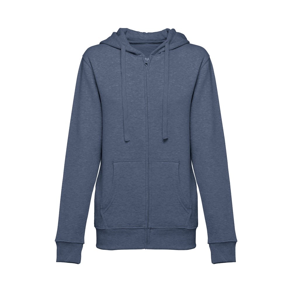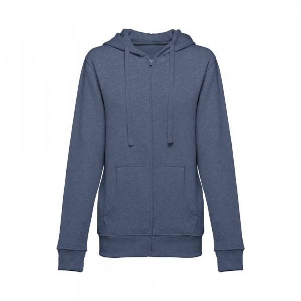 Dames sweatshirt van 50% katoen en 50% polyester (320 g/m²) met gekaarde binnenkant. De capuchon is gevoerd en bevat een gekleurde koordsluiting. Het voorste gedeelte heeft twee buidelzakken met een plastic sluiting. Stuk met manchetknopen en tailleband met elastiek. Maten: S, M, L, XL, XXL