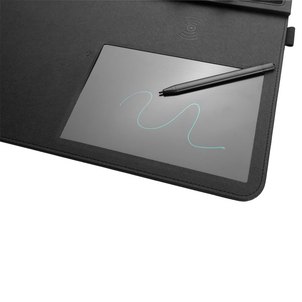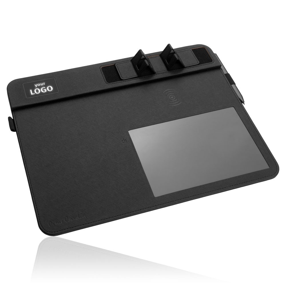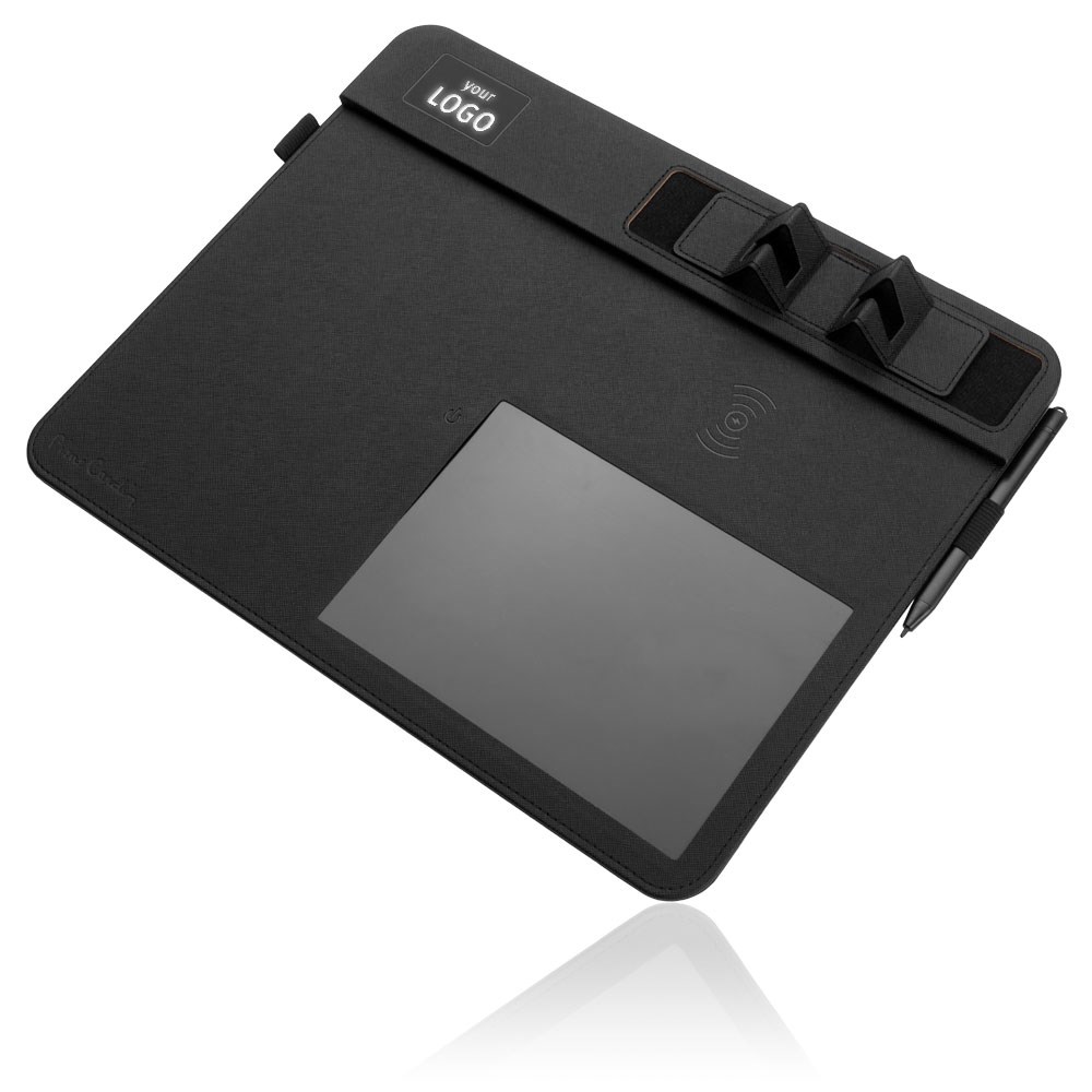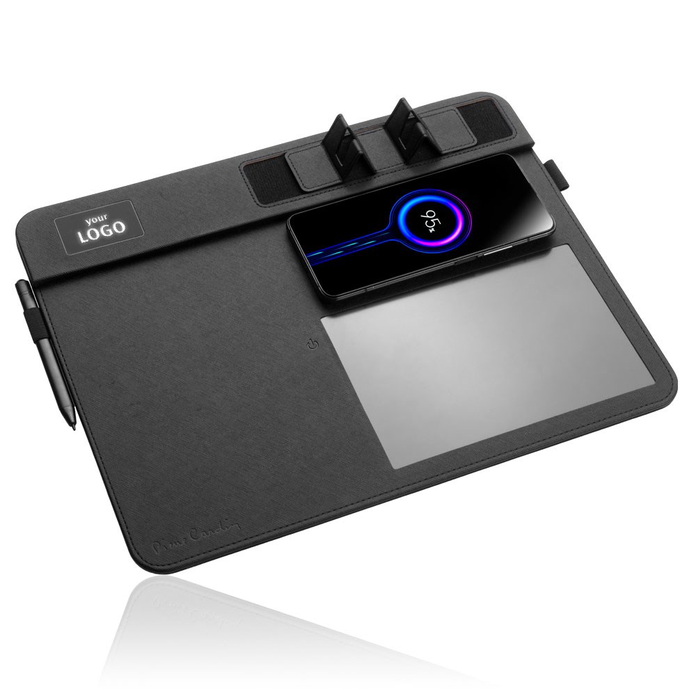 Een elegante, multifunctionele muismat van Pierre Cardin® gemaakt van gerecyled textiel. De muismat bevat een draadloze 10-W-lader met 5V/2A 9V/1.67A-ingangen en 5V/1A 9V/1.1A-uitgangen, een digitaal notitieblok en een styluspen, twee pennenhouders, glas met achtergrondverlichting voor het aanbrengen van het logo en een Extra USB -invoer. Om de muismat te gebruiken, kunt u de inbegrepen USB-C-kabel gebruiken. Verpakt in een Pierre Cardin® Luxury Box, wordt verzonden met een certificaat van authenticiteit. Aanbevolen druktechniek: lasergraveren L1 Maximale Drukgrootte: 35 × 20 mm Afmetingen: Muiskussen: 35 × 1,2 × 28 cm Verpakking: 6 × 3,5 × 29,5 cm Verpakkingseenheid: 20 stuks