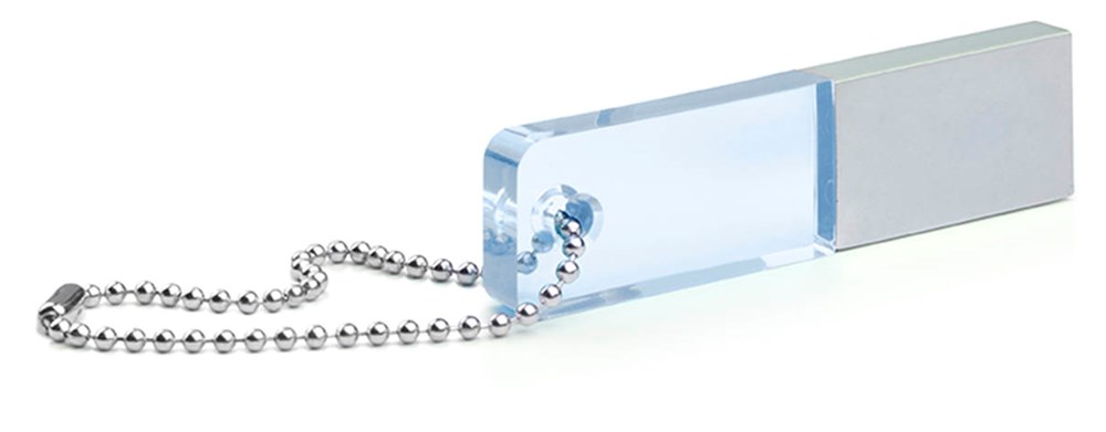 Dunne aluminium USB flash drive met een top deel van acryl wat oplicht wanneer de flash drive in een USB poort zit.