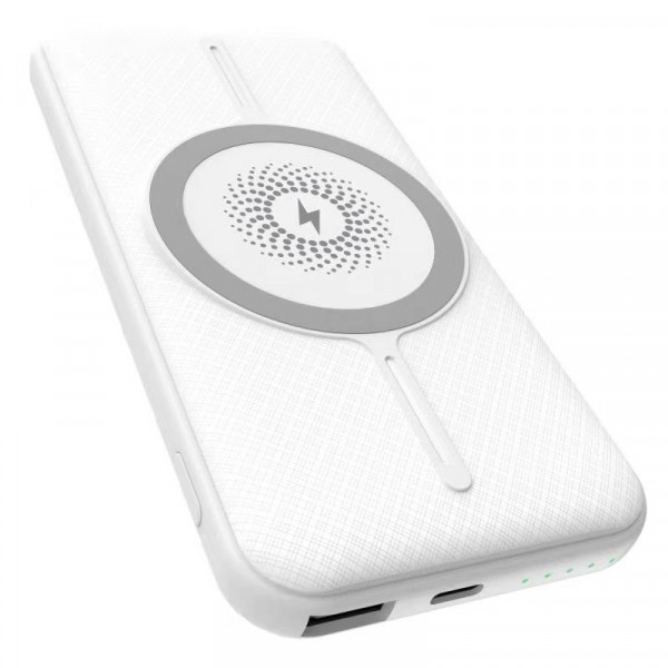 Draadloze oplader en powerbank met geïntegreerde magneten voor veilige hechting aan de smartphone. Kleuren: zwart, wit. Capaciteit: 10.000 mAh. Uitgang: 5V / 2A, draadloze uitgang: 5 W, geïntegreerd magnetisch oppervlak. Inclusief 1c print in één positie. Verpakking: witte vouwdoos.