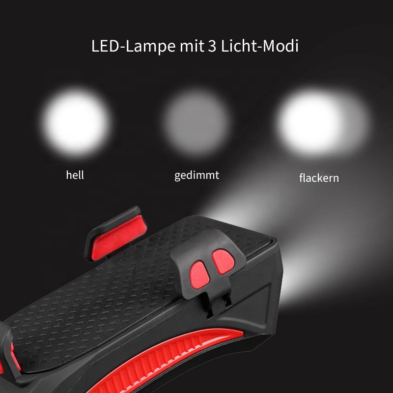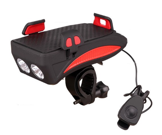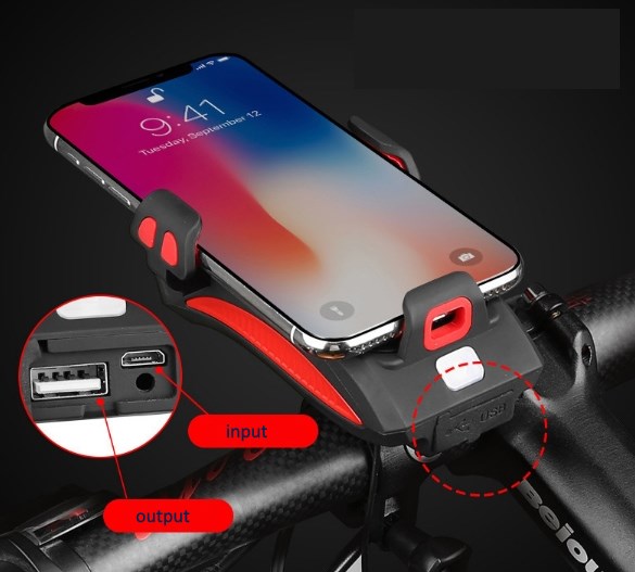 Spatwaterdichte smartphonehouder met geïntegreerd LED-lampje, powerbank en elektrische claxon. Kleuren: zwart, zwart-rood, zwart-blauw, zwart-oranje. Formaat: ca. 105 x 62 mm (gesloten),houdt smartphones met een grootte van ca. 4-6.3 inch. Capaciteit: 4.000 mAh, output: 0.8A, LED-licht: 400 lumen, 3 niveaus instelbaar (helder, gedimd, flikkeren). Hoorn: volume ca. 130 dB, 5 akoestische signalen instelbaar.Inclusief: USB oplaadkabel en houder. Afwerking: 1c print in één positie inbegrepen. Verpakking: kartonnen doos.