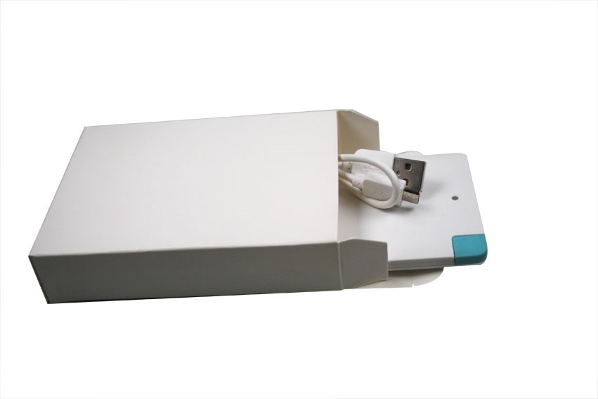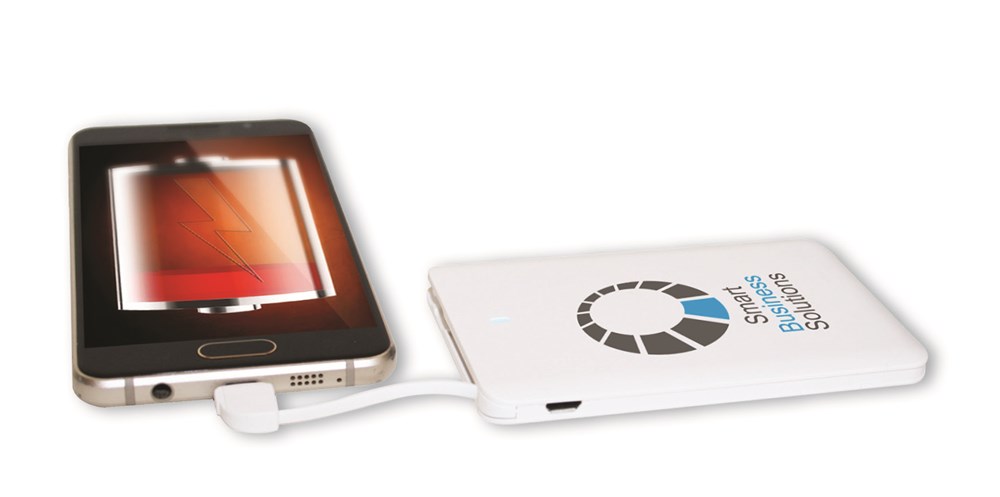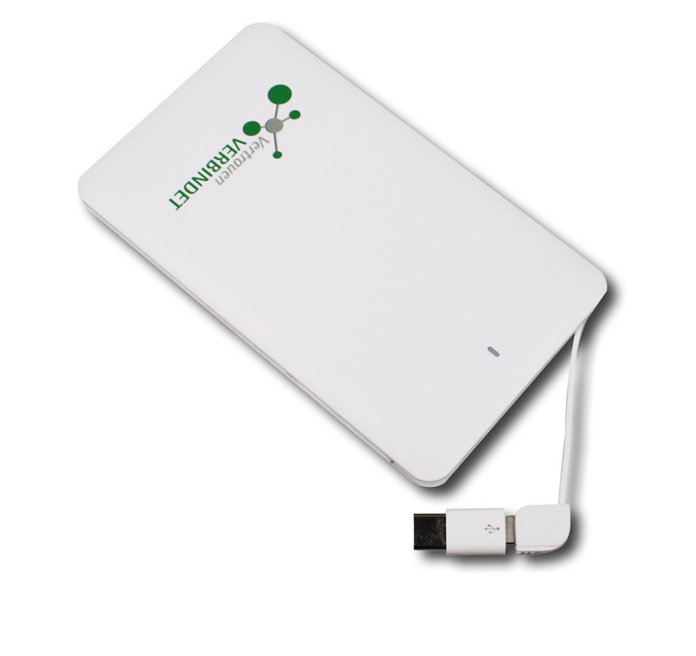 Slank energiewonder met geïntegreerde Micro-USB/Apple-aansluiting en USB-C-adapter. Formaat: 66 x 115 x 6 mm. Functie: Oplaadbare lithium-polymeerbatterij, geïntegreerde 2in1 oplaadkabel (Micro-USB & Apple-aansluiting) en USB-C-adapter. Kleur wit. Vermogen: 4000 mAh, uitgang: 5 V / 1 A. Inclusief: USB-C-adapter, micro-USB-kabel en 1c druk in één positie. Verpakking: witte vouwdoos.