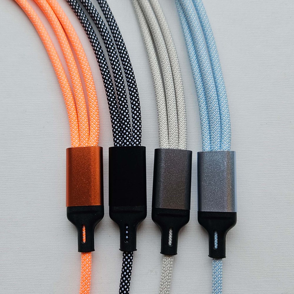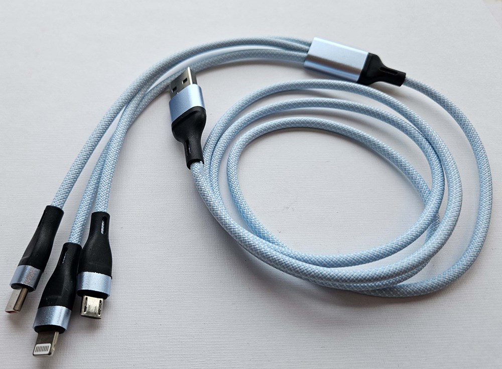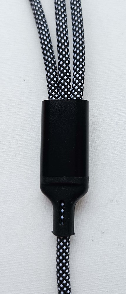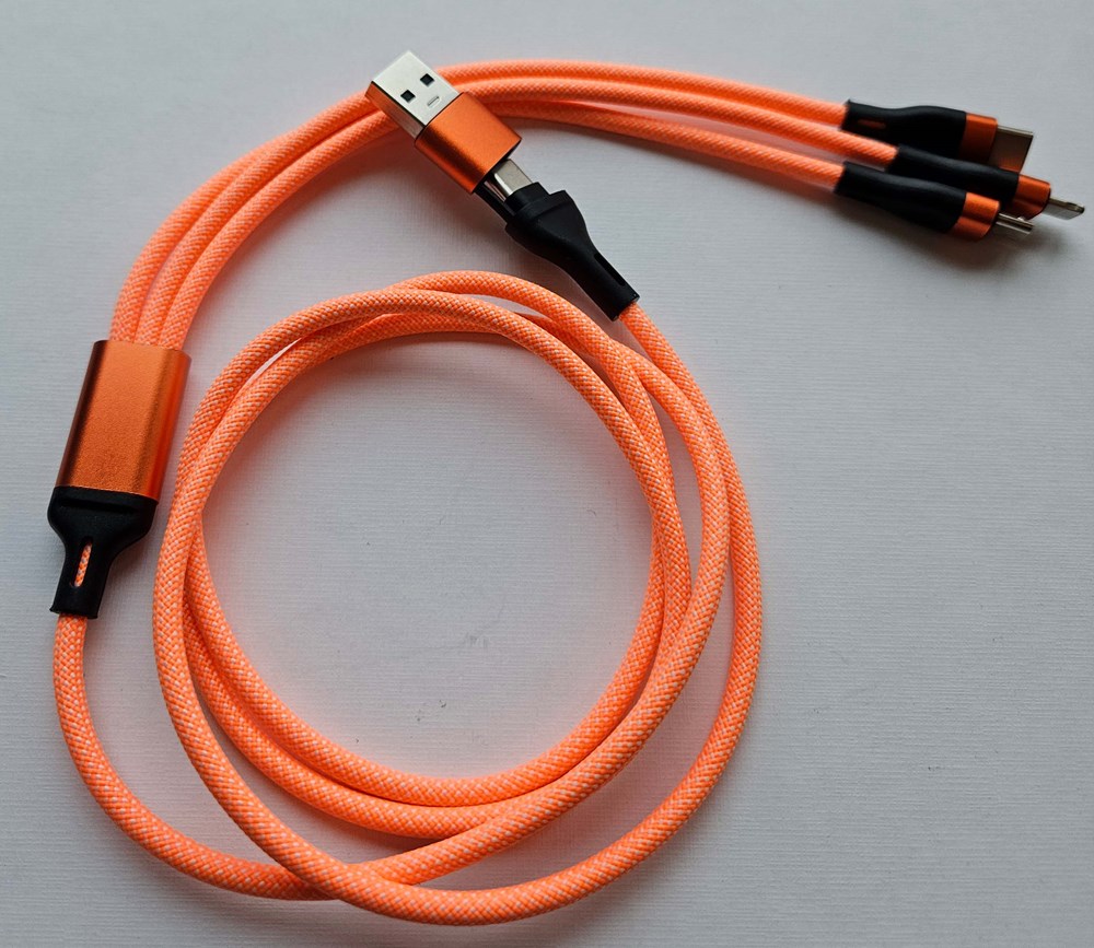 Oplaadkabel met USB-C en USB-A ingang, uitgang: USB-C 3A, Micro-USB 2A en Lightning 2.4A. Lengte: ca. 120 cm. Kleuren: zwart, wit, oranje, lichtblauw. Afwerking: Inclusief lasergravering op één positie. Verpakking: Polybag.