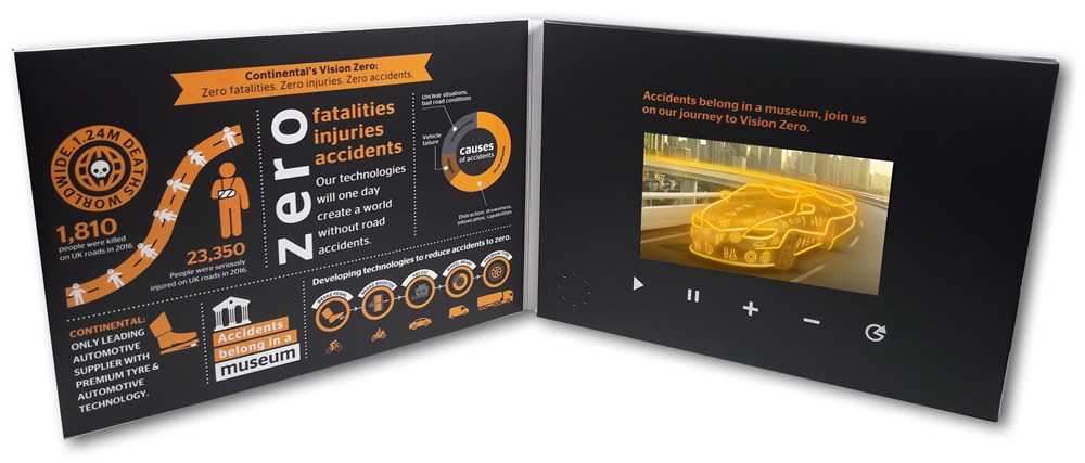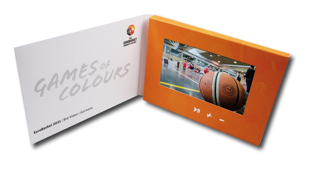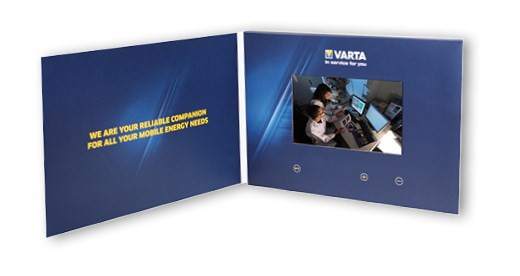 Gevouwen kaart gedrukt in klantontwerp met geïntegreerd IPS-display. Formaat: DIN A5, DIN A6 of DIN lang, andere formaten op aanvraag. Print: 4/0 gekleurd + matte of glanzende vernis. Inclusief: video-opname, startlogo, maximaal drie bedieningsknoppen. Prestaties: 4,75 "IPS-scherm (102 x 57 mm) voor haarscherpe beelden vanuit alle hoeken, resolutie: 1280 x 720 px, 2 uur batterijduur, 256 MB opslagcapaciteit, geïntegreerde luidspreker, met punching op aanvraag, videogegevens optioneel uitwisselbaar of met een wachtwoord beveiligd.